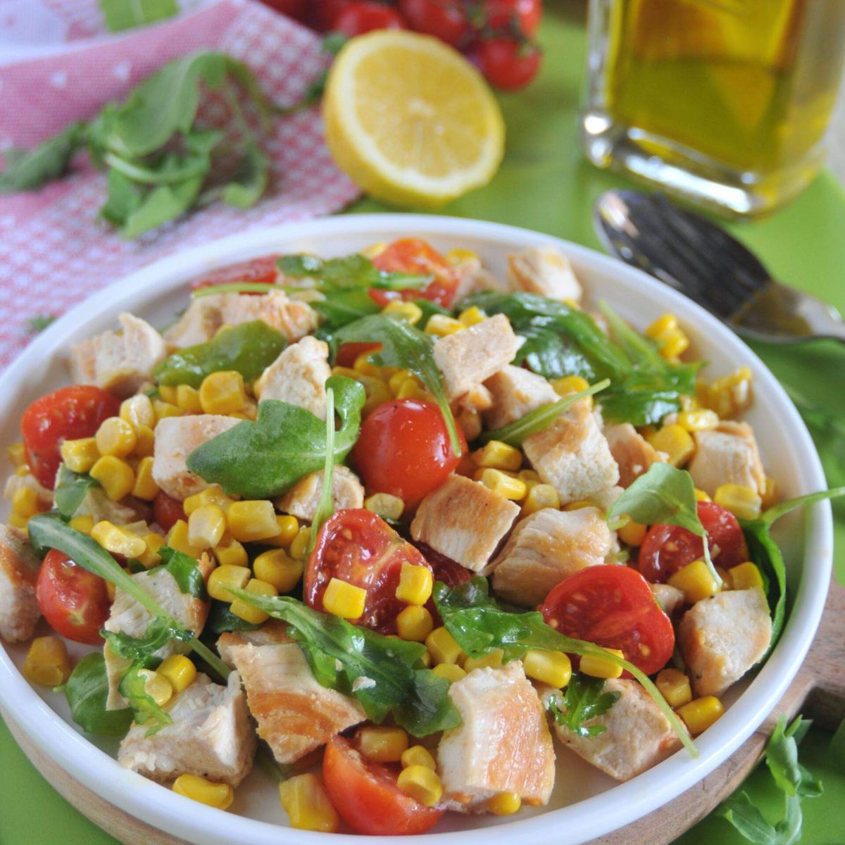 insalata con straccetti di pollo, olive nere, mais, carciofi, pomodoro